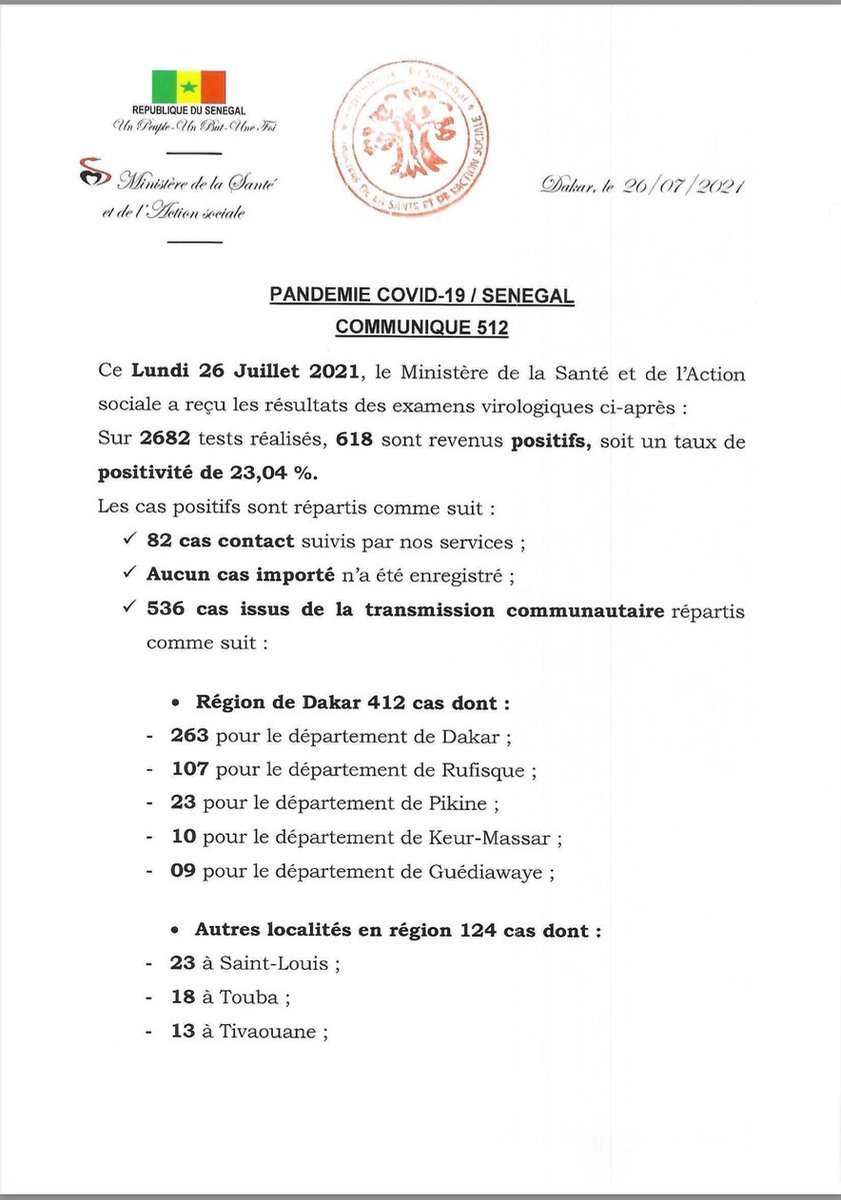 Ces tests positifs proviennent de 82 cas contacts suivis par les autorités sanitaires et de 536 cas issus de la transmission communautaire (412 cas à Dakar et 124 cas dans les autres localités en région).