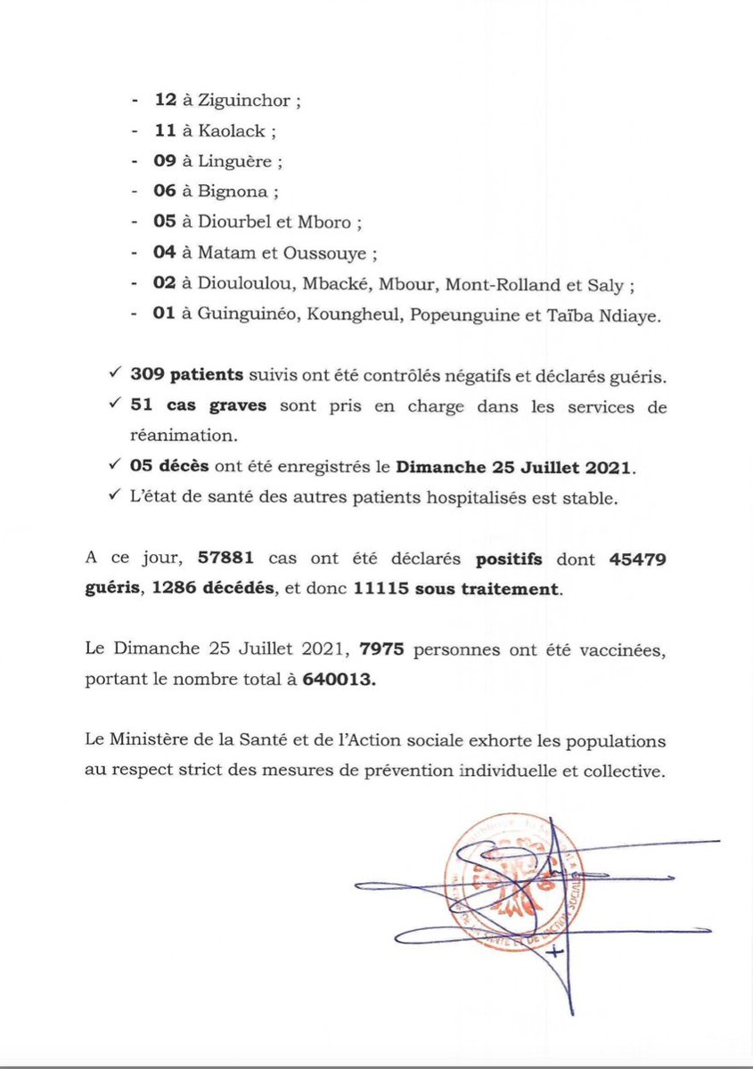 Pis, 5 décès liés à la Covid-19 ont été enregistrés hier dimanche 25 juillet.
