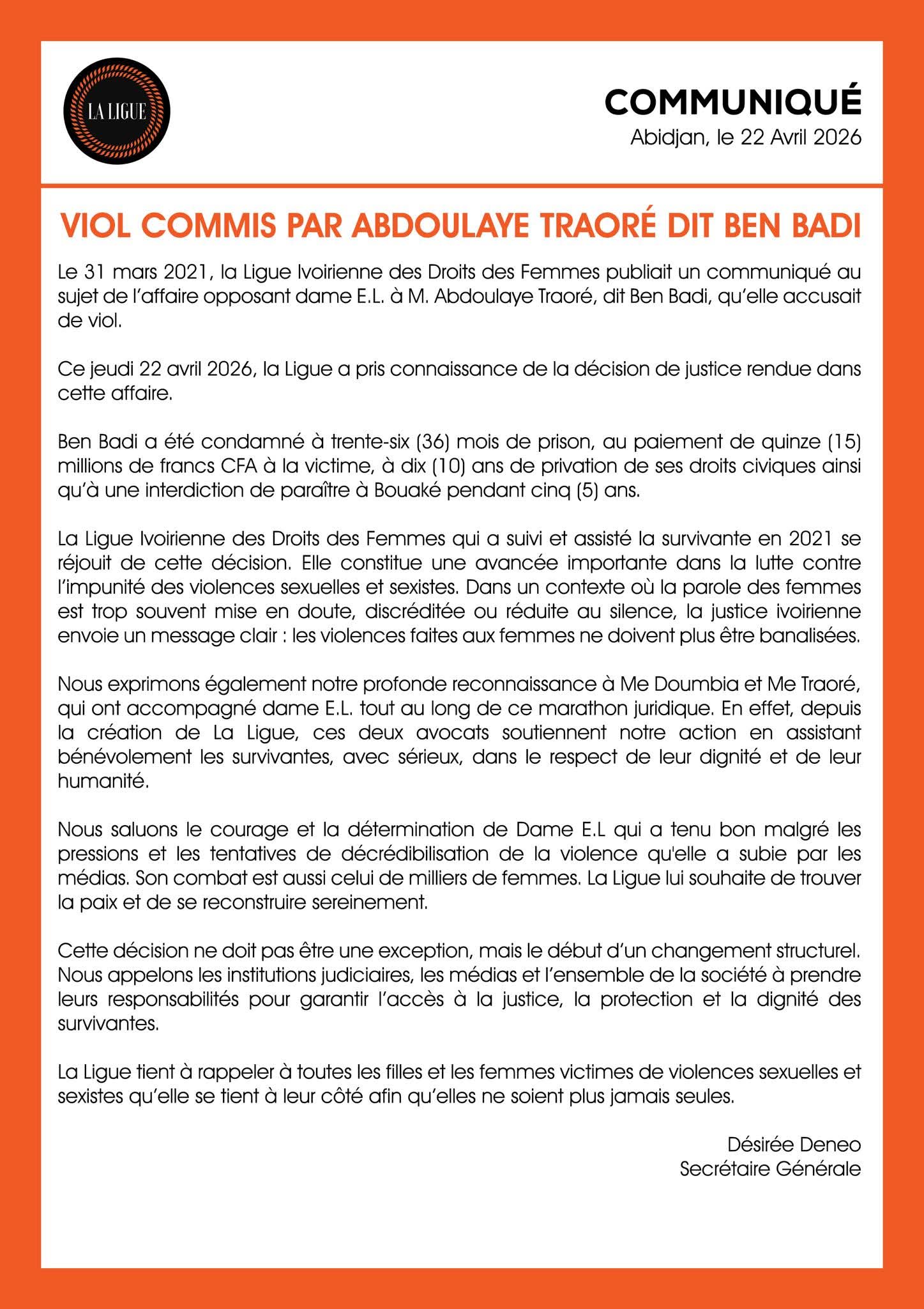 La justice ivoirienne a condamné, le 22 avril 2026, l’ancien international Abdoulaye Traoré, alias « Ben Badi », à trois ans de prison ferme pour viol, au terme d’une procédure enclenchée en 2021.