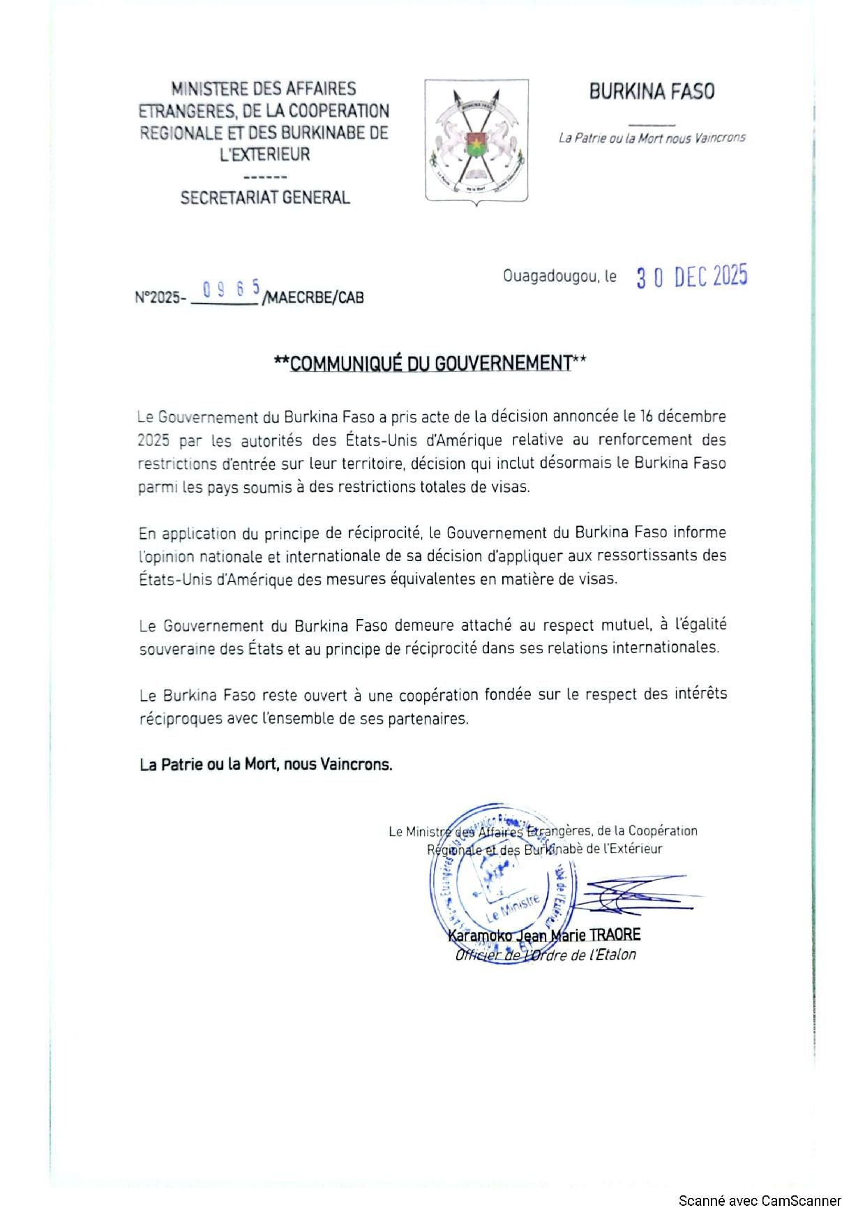 Dans un communiqué signé du ministre des Affaires étrangères, de la Coopération régionale et des Burkinabè de l'Extérieur, Karamoko Jean-Marie Traoré, les autorités burkinabè ont indiqué « avoir pris acte » de la décision américaine annoncée le 16 décembre 2025, portant sur le renforcement des mesures restrictives en matière de visas.