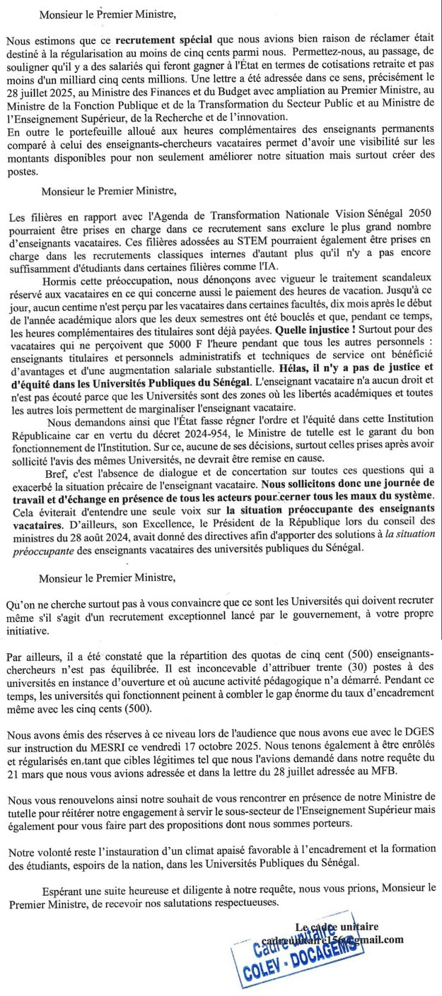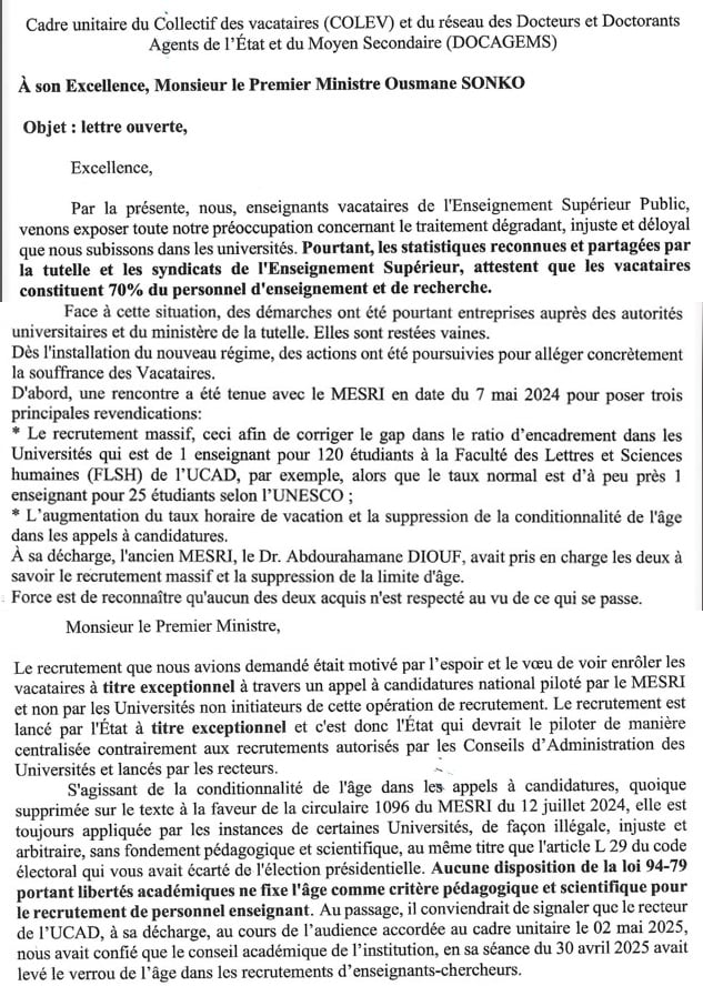 Lisez bien la lettre et vous vous rendrez compte de l'injustice que les professeurs vacataires des universités publiques du Sénégal souffrent.