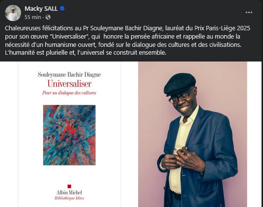 « Chaleureuses félicitations au Pr. Souleymane Bachir Diagne, lauréat du Prix Paris-Liège 2025 pour son œuvre 'Universaliser', qui honore la pensée africaine et rappelle au monde la nécessité d’un humanisme ouvert, fondé sur le dialogue des cultures et des civilisations. L’humanité est plurielle et l’universel se construit ensemble", a réagi Macky Sall sur ses plateformes sociales.