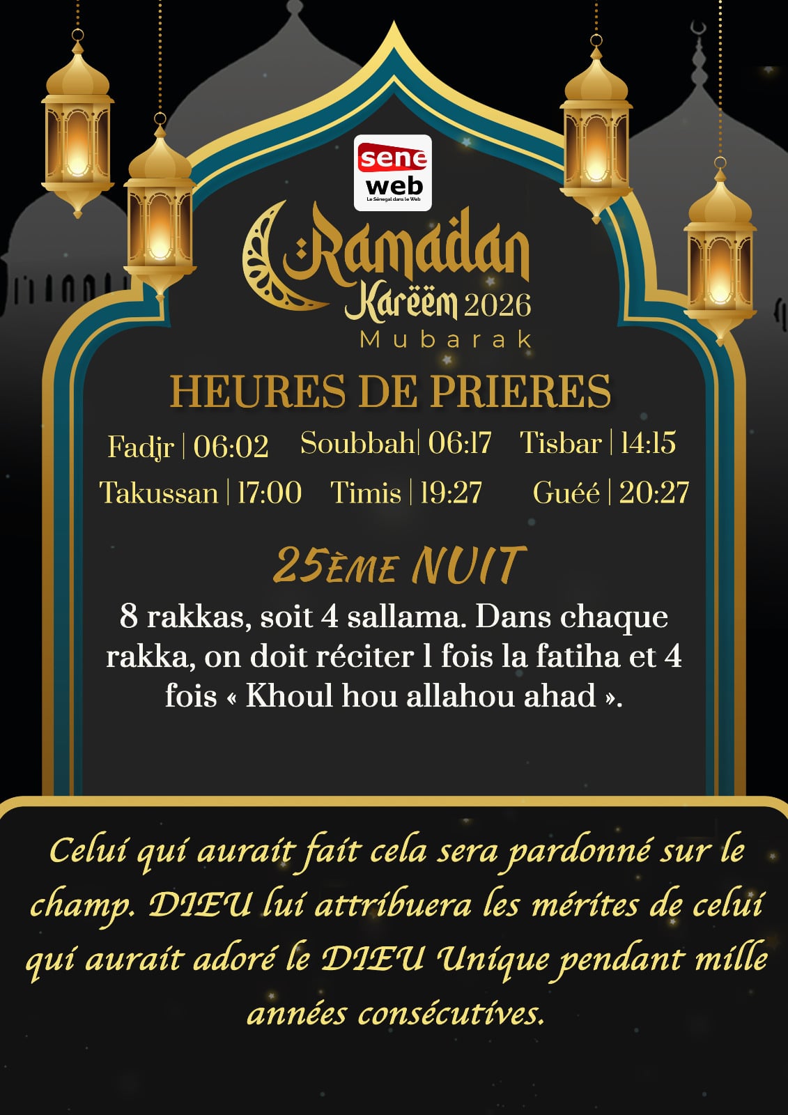 Le 14 mars 2026 marque la 25ème nuit du mois sacré du Ramadan au Sénégal, une nuit d’une grâce et d’une récompense spirituelle immenses selon les recommandations partagées par Seneweb. Cette nuit est particulièrement célébrée pour la promesse d’un pardon immédiat et de mérites équivalents à mille années d’adoration exclusive d’Allah.