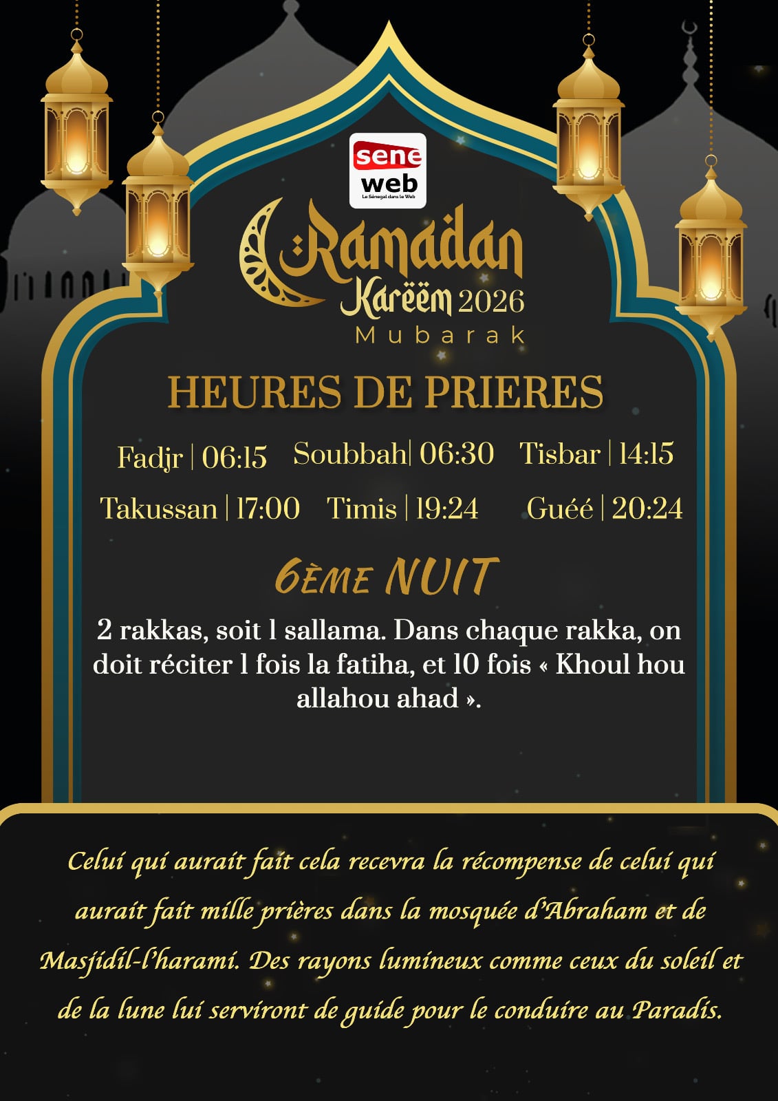 Le 23 février 2026 marque la 6ème nuit du mois sacré du Ramadan au Sénégal, une nuit d’une grande valeur spirituelle selon les recommandations diffusées par Seneweb. Cette nuit est particulièrement mise en avant pour sa récompense exceptionnelle liée à la prière surérogatoire (nafila) proposée.Les Recommandations pour la Nafila de la 6ème Nuit