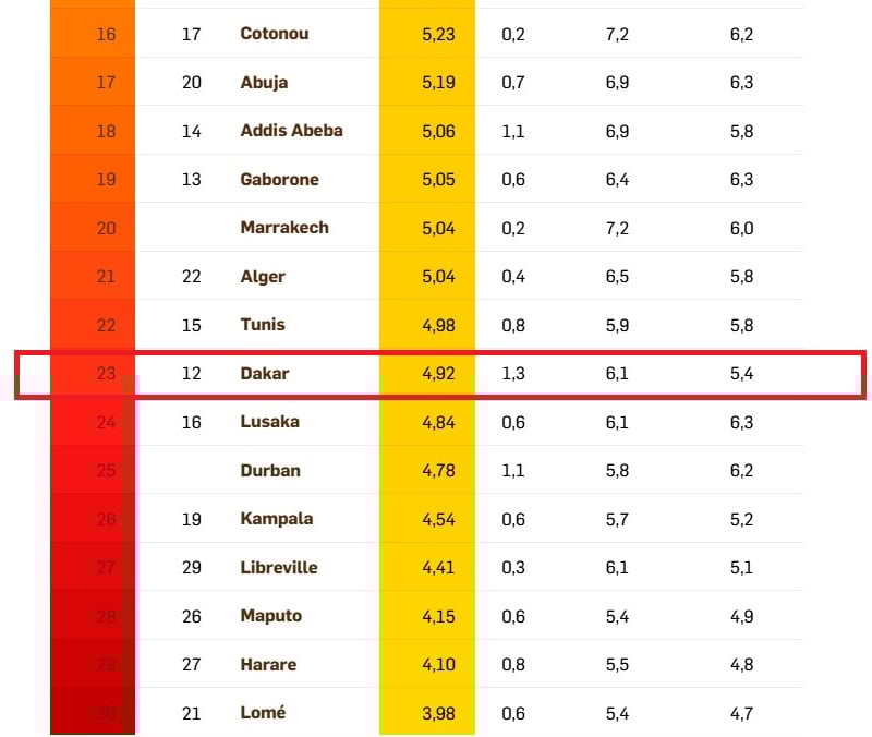 Douzième (12e) au classement l'année dernière avec un indice global à 6,5, Dakar a dégringolé au classement. En 2025, la capitale sénégalaise est tombée à la 23e place, avec un indice global à 4,92.