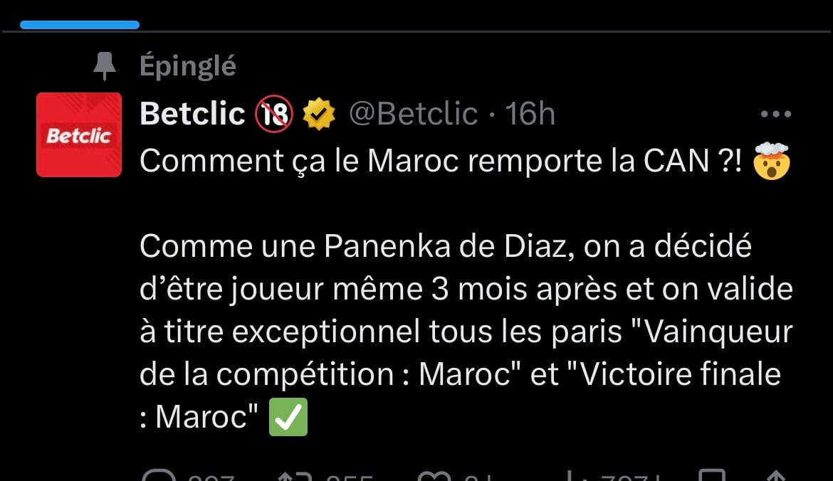 « Comme une Panenka de Diaz, on a décidé d'être joueur même 3 mois après et on valide à titre exceptionnel tous les paris Vainqueur de la compétition : Maroc et Victoire finale », a expliqué le bookmaker à travers le réseau social X.