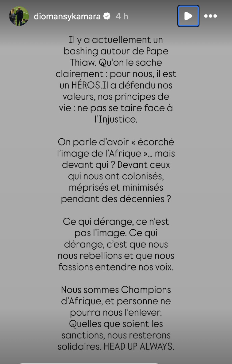 Au moment où se trame des dessins les plus sombres contre l’équipe nationale du Sénégal et son entraîneur, des fils du pays montent au créneau pour dire stop. Dans une tribune partagée sur Instagram, Diomansy Kamara a, de nouveau, répliqué à ceux qui réclament la tête de Pape Thiaw et à ceux qui prétendent que le Sénégal a «écorné» l’image de l’Afrique. Ci-dessous son texte intégral.