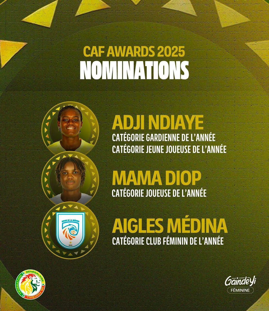 Le football féminin sénégalais continue de gravir les échelons sur la scène africaine. Trois représentants du Sénégal figurent parmi les nominées aux Confédération africaine de football (CAF) Awards 2025. Adji Ndiaye est sélectionnée dans la catégorie gardienne de l'année et jeune joueuse de l'année, Mama Diop est nominée dans la catégorie joueuse de l'année et les Aigles de la Médina dans la catégorie club féminin de l'année.
