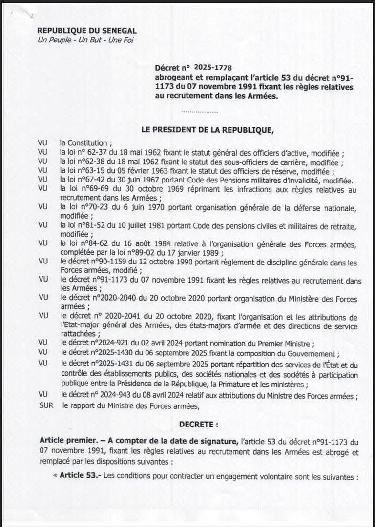Le Président de la République, Bassirou Diomaye Faye, a signé le Décret n° 2025-1778 le 30 octobre 2025 à Dakar, abrogeant et remplaçant l'Article 53 du décret de 1991 concernant les règles relatives au recrutement dans les Armées.