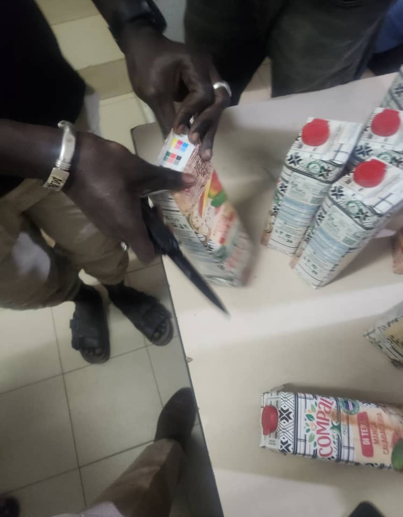 Un dispositif de surveillance est aussitôt mis en place. Vers 20h20, le véhicule correspondant à la description est aperçu en plein débarquement de colis à la gare routière. Interpellé, le chauffeur M. Diop, 50 ans, chauffeur, reconnaît avoir reçu un colis contenant des bouteilles de boisson de marque « Compal ».