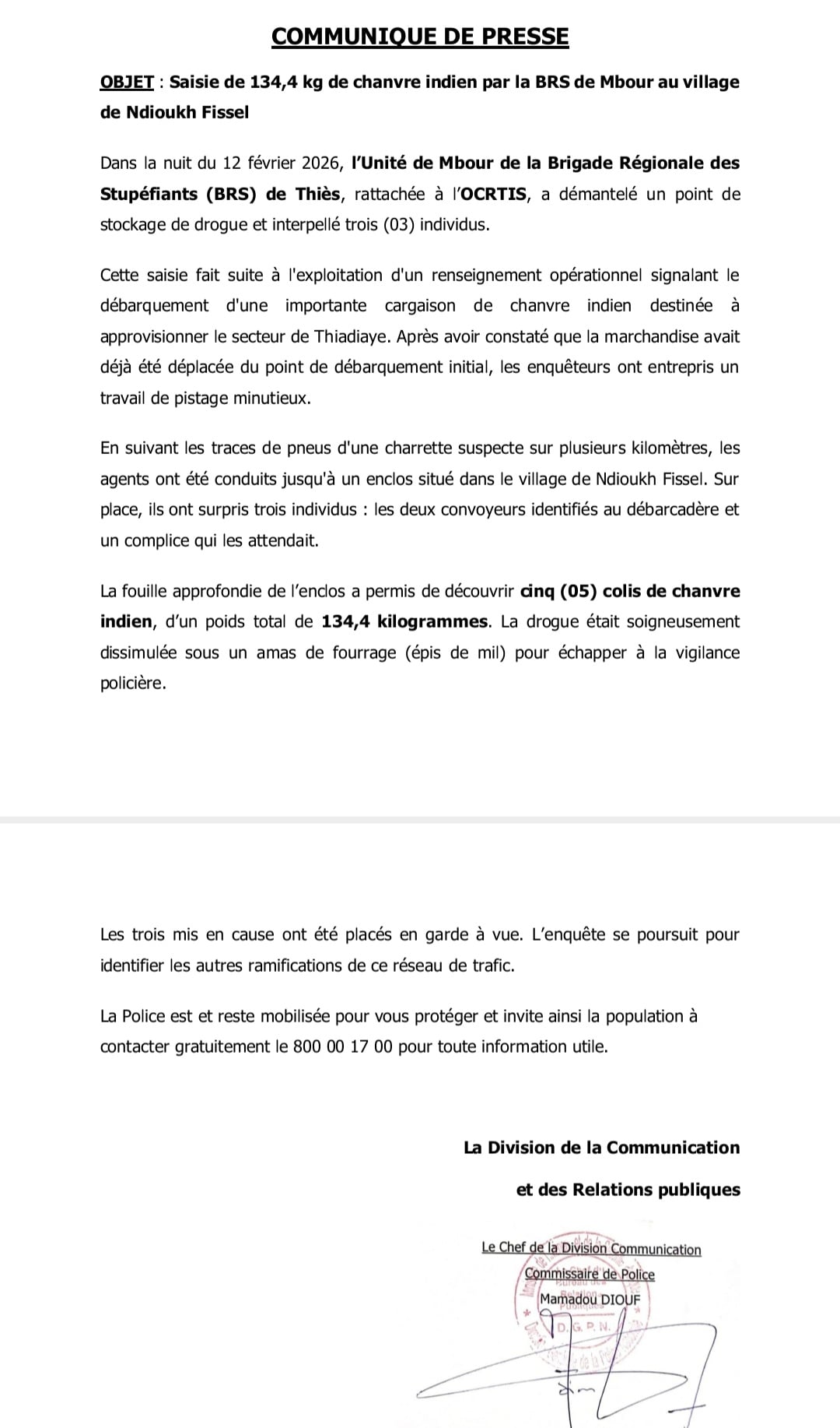 Le Communiqué a été transmis à Seneweb par le Commissaire Mamadou Diouf, Chef de la Division Communication et des Relations Publiques de la Police nationale.