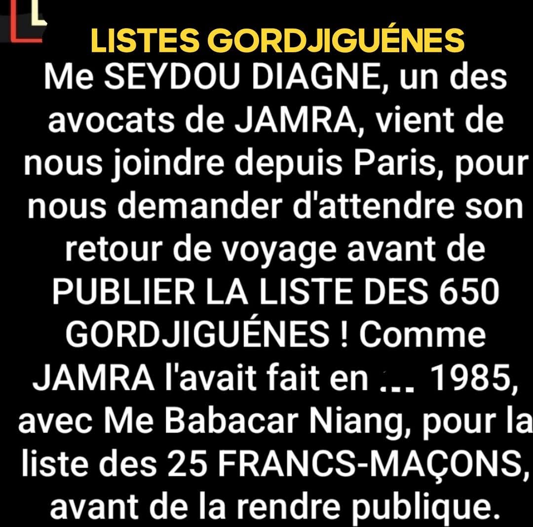 Dans un post sur sa page Facebook, l’organisation indique que « Me Seydou Diagne, un des avocats de JAMRA, vient de nous joindre depuis Paris, pour nous demander d’attendre son retour de voyage avant de publier la liste des 650 Homosexuels ».