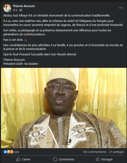 «Abdou Aziz Mbaye fut un véritable monument de la communication traditionnelle. Il a su, avec une maîtrise rare, allier la richesse du wolof et l’élégance du français pour transmettre un savoir ancestral empreint de sagesse, de finesse et d’une profonde humanité. Son verbe, sa pédagogie et sa présence demeureront une référence pour toutes les générations de communicateurs», a-t-il publié sur Meta (Facebook).