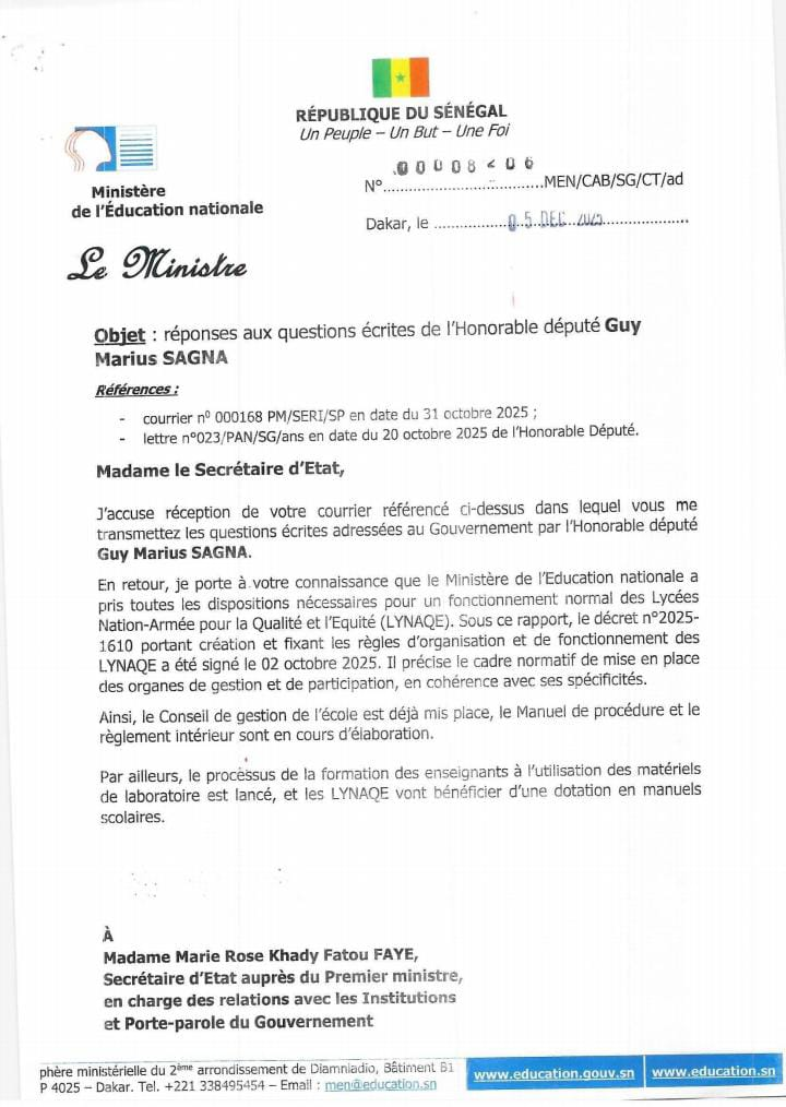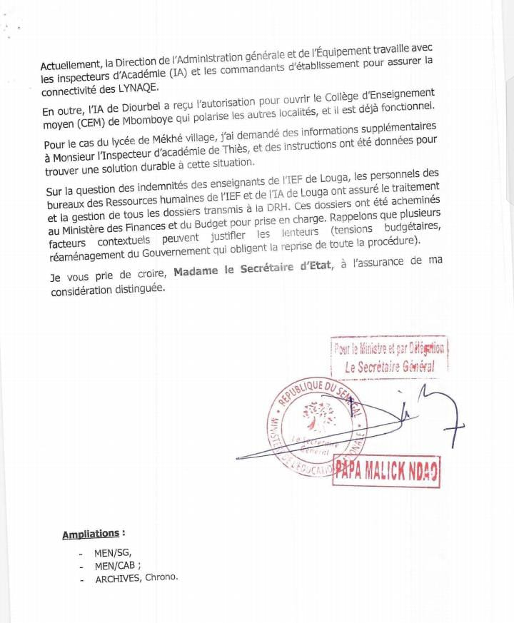 A travers une note reçu à Seneweb, le ministère de l'Education a répondu au parlementaire. Pour la série scientifique du lycée de Mékhé Village, le ministère fait savoir que des instructions ont été données pour trouver une solution. Pour les LYNAQUE, le ministère assure travaillé de concert avec les inspecteurs d'académie pour assurer sa connectivité. Pour terminer, pour les indemnités des enseignants de l'IEF de Louga, les services dirigés par Moustapha Guirassy affirment avoir traité et géré tous les dossiers transmis, qui ont ensuite été acheminés au ministère des Finances et du Budget.