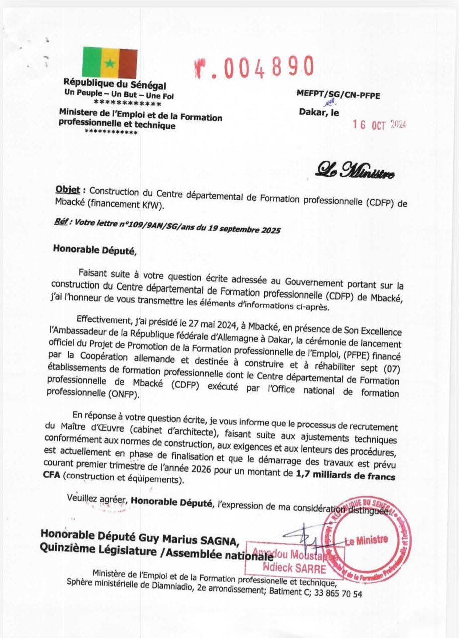 Le gouvernement annonce que le processus de recrutement du maître d’œuvre pour la construction du Centre départemental de formation professionnelle (CDFP) de Mbacké est en phase de finalisation. Le démarrage des travaux est prévu au premier trimestre 2026, avec un budget de 7 milliards de francs CFA, incluant construction et équipements.
