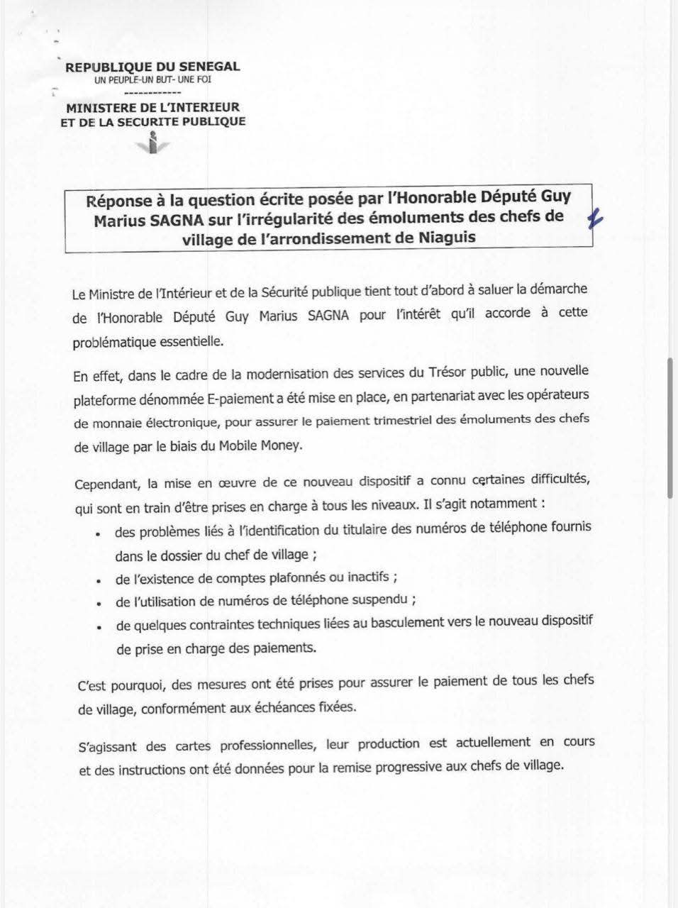 Émoluments des chefs de village de Niaguiss