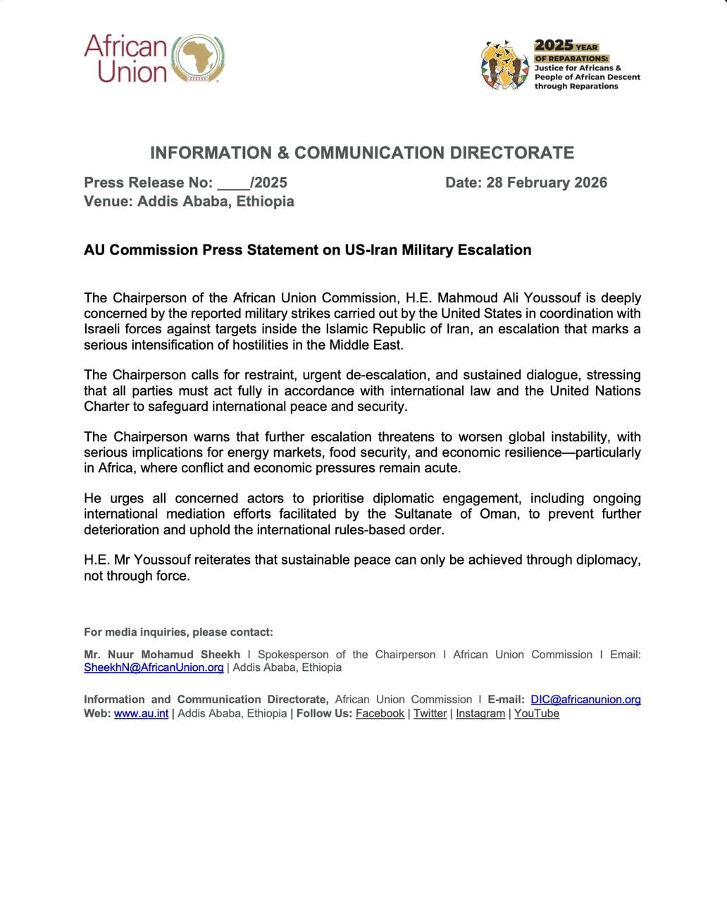 « Il exhorte tous les acteurs concernés à privilégier l'engagement diplomatique, notamment les efforts de médiation internationale en cours, facilités par le Sultanat d'Oman, afin de prévenir toute nouvelle détérioration et de préserver l'ordre international fondé sur des règles. S.E. M. Youssouf réaffirme que la paix durable ne peut être atteinte que par la diplomatie, et non par la force », a laissé entendre la Commission de l’UA.